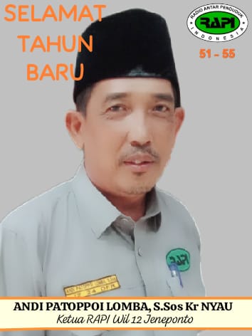 JENEPONTO – pantau24jam.net. Ketua Radio Antar Penduduk Indonesia (RAPI) Wilayah 12 Jeneponto, Andi Patoppoi Lomba Kr Nyau ucapkan Selamat Tahun Baru 2026. “Selamat tahun baru 2025, mari menyonsong dan harapan baru untuk Jeneponto Bahagia”, ujar Ketua Radio Antar Penduduk Indonesia (RAPI) Wilayah 12 Jeneponto, Andi Patoppoi Lomba, S.Sos Kr Nyau. Kamis, 1/1/2026. Andi Patoppoi Lomba, S.Sos Kr Nyau saat ini Kepala Pelaksana Badan Penanggulangan Bencana Daerah (BPBD) Kabupaten Jeneponto. “Dalam situasi cuaca yang tidak menentu yang terkadang cuaca ekstrem diharapkan warga masyarakat untuk selalu waspada”, terangnya. Kepada keluarga besar Radio Antar Penduduk Indonesia (RAPI) Wilayah 12 Jeneponto, saya berharap agar memberikan informasi cuaca yang valid di frekuensi 143.200. Jelasnya. “Untuk itu, informasi cuaca dan bilamana terjadi kebencanaan itu sangat penting di sampaikan di frekuensi. Sekali lagi selamat tahun baru 2026, salam RAPI 51.55 RAPI Jaya selalu, rukun di udara akrab di darat dan iman di hati”, pungkasnya. Yudhi