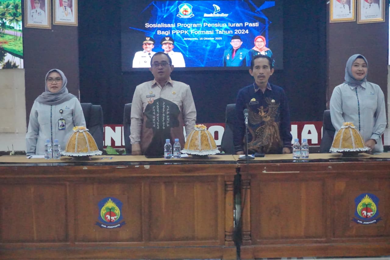 Melalui Badan Kepegawaian dan Pengembangan Sumber Daya Manusia (BKPSDM) bekerja sama dengan PT Bank Sulselbar, digelar Sosialisasi Program Pensiun Iuran Pasti bagi Pegawai Pemerintah dengan Perjanjian Kerja (PPPK) Formasi Tahun 2024 di Ruang Pola Kantor Bupati Jeneponto. Kamis, 16/10/2025.