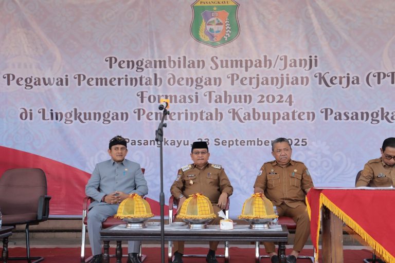 PASANGKAYU – pantau24jam.net. Sebanyak 412 orang Pegawai Pemerintah dengan Perjanjian Kerja (PPPK) formasi tahun 2024, Resmi diambil sumpah/janji oleh Bupati Pasangkayu, H. Yaumil Ambo Djiwa, S.H, di Pelataran Kantor Bupati Pasangkayu. Selasa (23/9/2025).