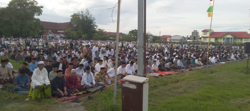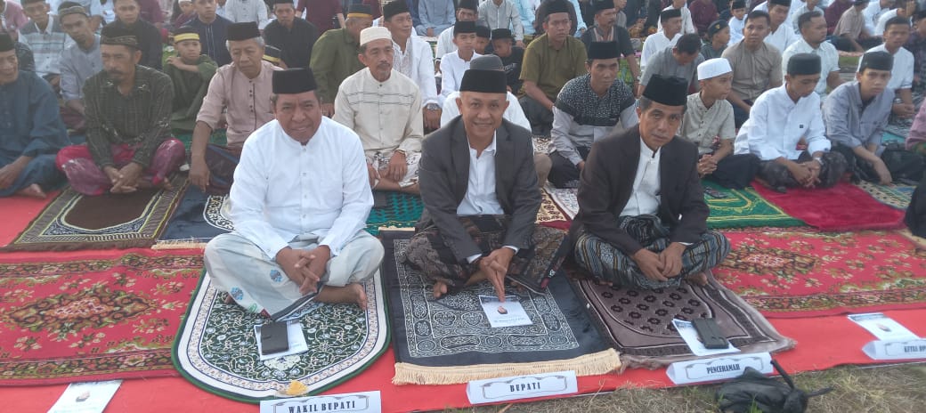 Sebelum menempati posisinya, bupati Natsir Ali, berkesempatan menyalami sejumlah jamaah shalat id yang berada di samping dan belakang tempat duduknya.