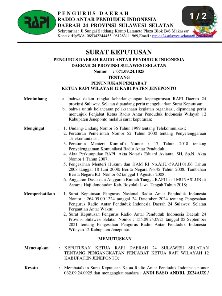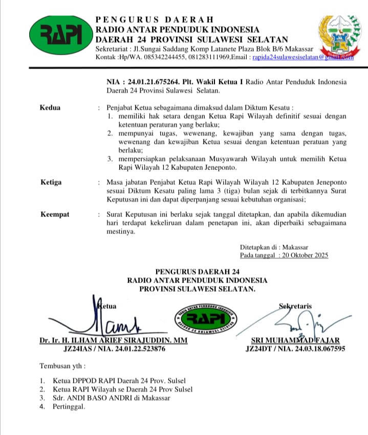 “Pengurus Radio Antar Penduduk Indonesia (RAPI) Daerah Sulsel tidak tinggal diam, kami beri amanah kepada Wakil Ketua 1 RAPIDA Sulsel Andi Baso Andri atau akrab disapa Aba sebagai Plt Ketua Rapi Jeneponto”, ujar Ketua Radio Antar Penduduk Indonesia (RAPI) daerah Sulsel, Ilham Arief Sirajuddin JZ24IAS.