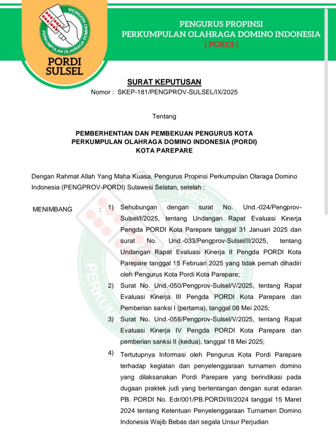 Pengurus Provinsi Perkumpulan Olahraga Domino Indonesia (PORDI) Sulawesi Selatan resmi mencabut Surat Rekomendasi No. Rekom.-165/Pengprov-Sulsel/VIII/2025 terkait penyelenggaraan Open Turnamen Domino Walikota Cup Parepare 2025.