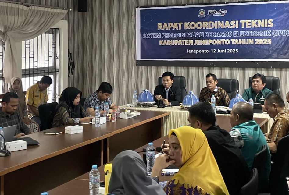 Kerjasama tersebut dengan menyelenggarakan Rapat Koordinasi Teknis (Rakortek) Sistem Pemerintahan Berbasis Elektronik (SPBE), di Ruang Tamarunang Kantor Bupati Jeneponto. Kamis, 12/6/2025.
