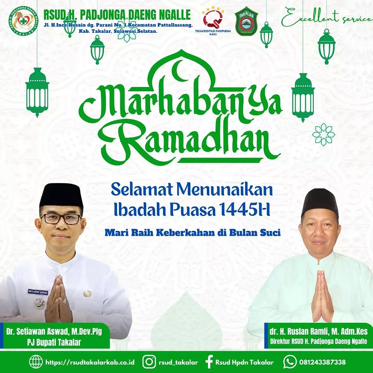 Takalar, Pantau24jam.Net – dr.H.Ruslan Ramli,M.ADM.Kes Direktur Rumah Sakit Umum Daerah Haji Pajhonga Daeng Ngalle (RSUD HPDN) berserta Segenap Keluarga RSUD HPDN Takalar Mengucapkan ” Marhaban ya Ramadhan Selamat menunaikan ibadah Puasa 1445 Hijriah Tahun 2024 Masehi