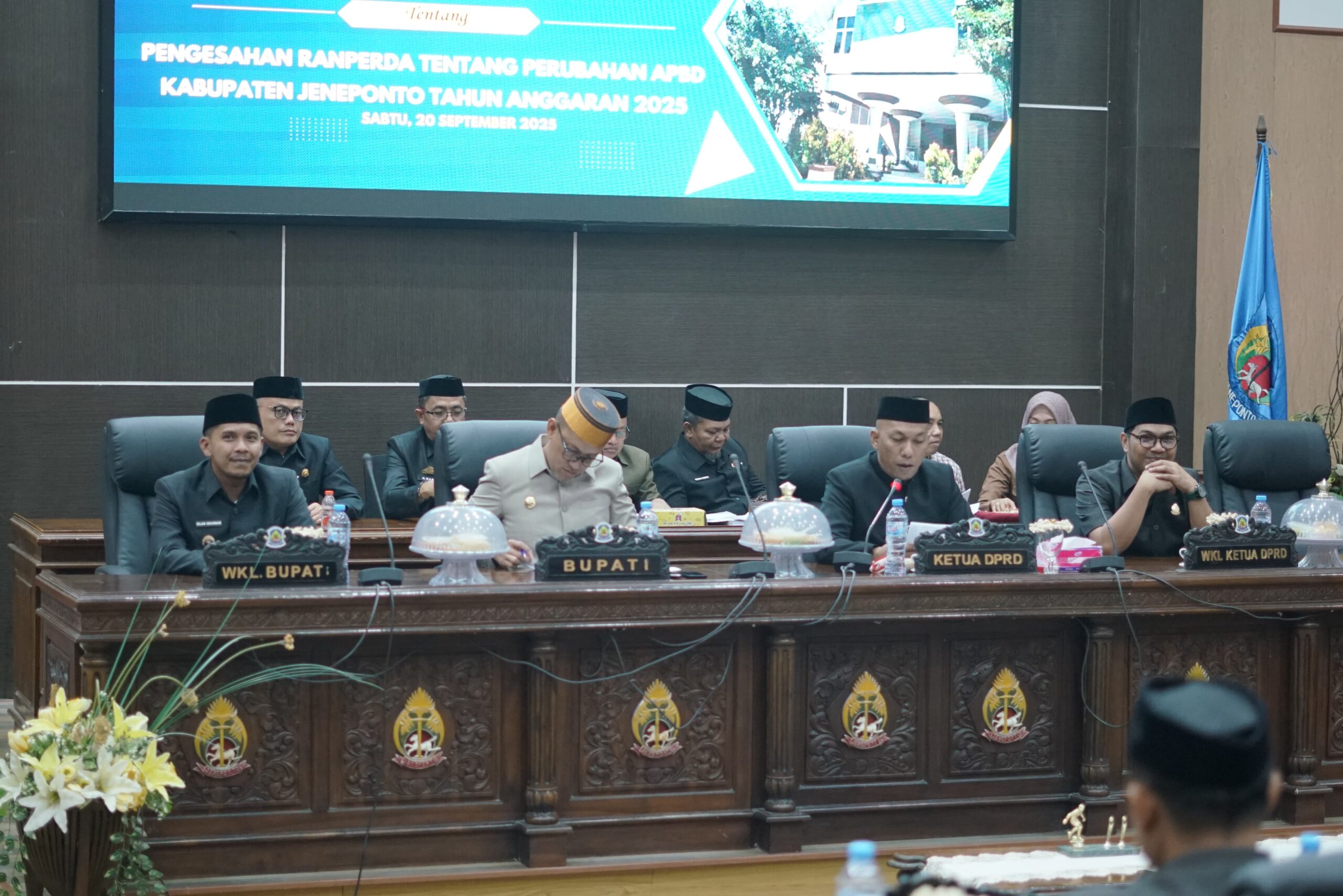 JENEPONTO – pantau24jam.net. Rapat Paripurna Pengesahan Ranperda Perubahan APBD Kabupaten Jeneponto TA 2025 bertempat di ruang sidang Paripurna DPRD Kabupaten Jeneponto. Sabtu, 20/9/2025 sekira pukul 23.01 Wita