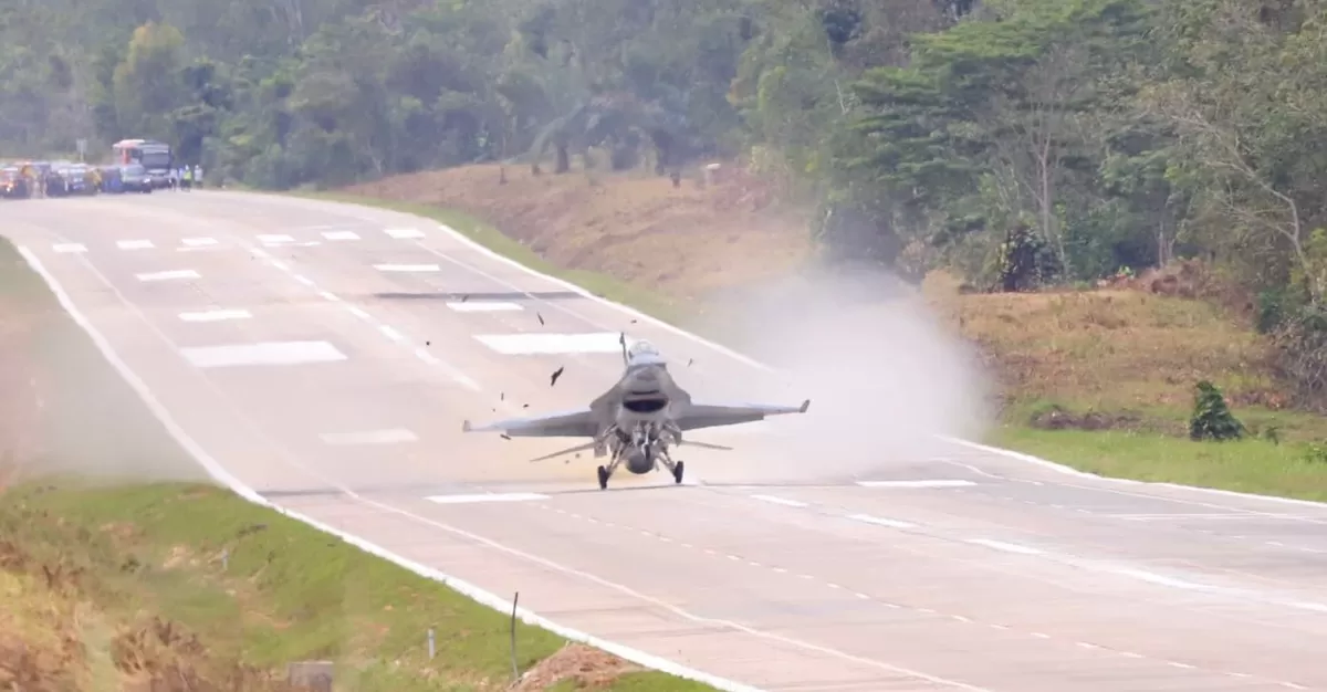 Dua pesawat tempur, Super Tucano dan F-16, mendarat dan lepas landas dengan aman dalam uji coba yang disebut sebagai yang pertama dilakukan di jalan tol di Indonesia.
