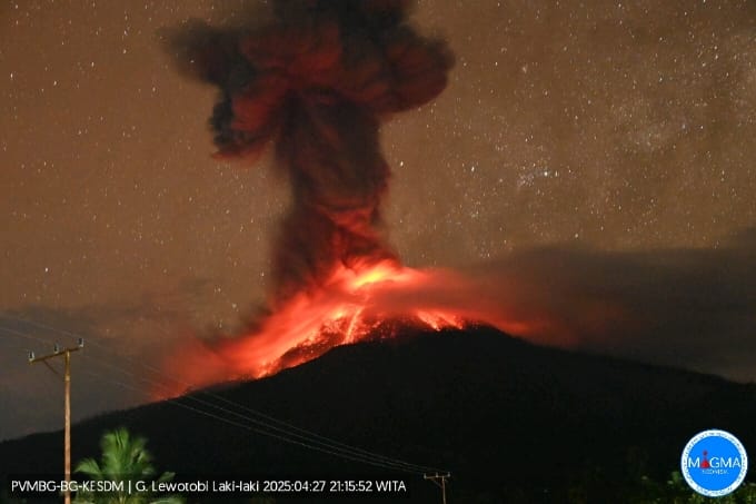 FLORES TIMUR – pantau24jam.net. Telah terjadi erupsi Gunung Lewotobi Laki-laki, Nusa Tenggara Timur dengan tinggi kolom abu teramati ± 4.000 m di atas puncak (± 5.584 m di atas permukaan laut). Ahad, 27/4/2025 pukul 21:15 WITA.