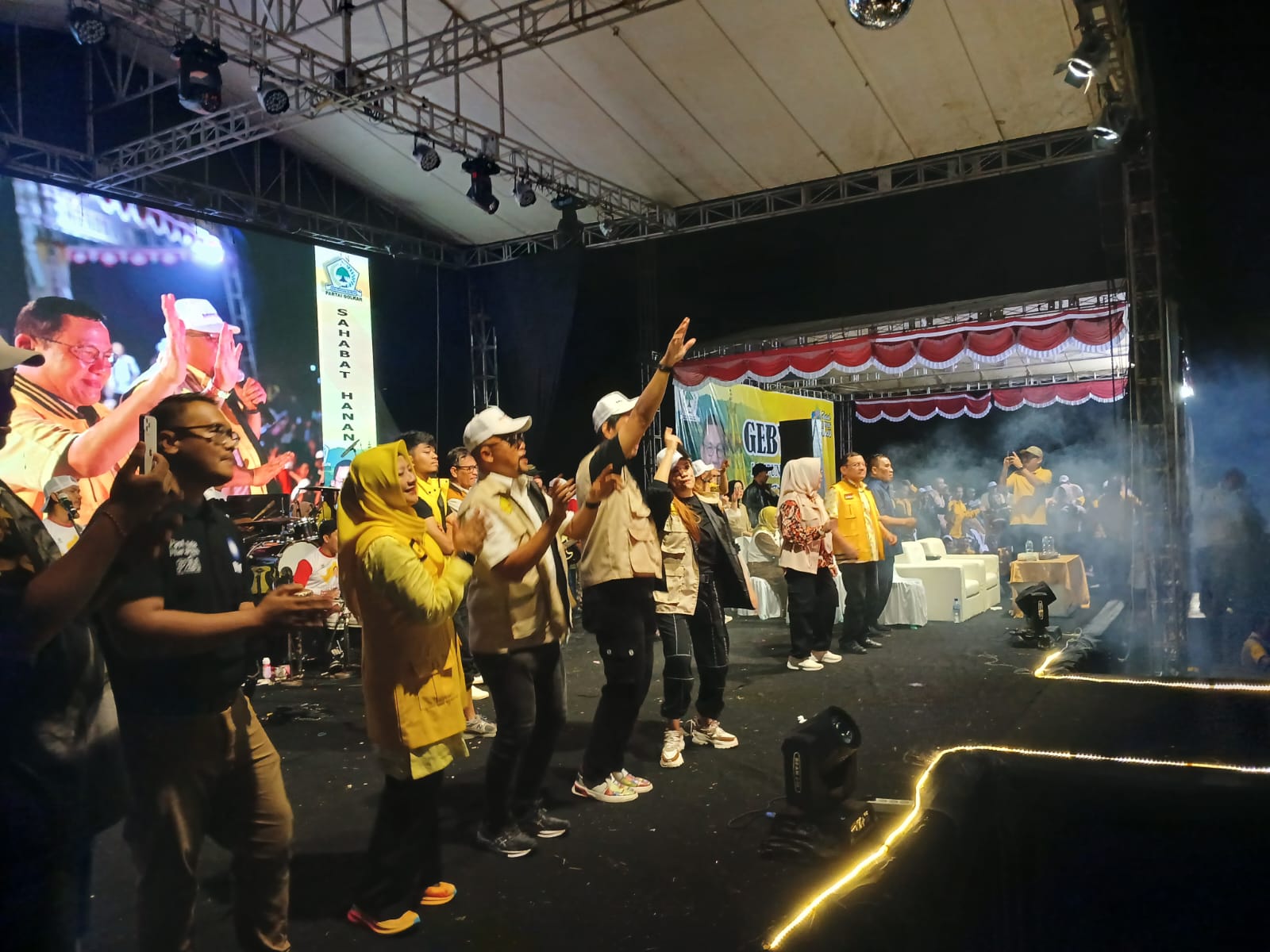 “Malam ini, kita tampil disini untuk menyelenggarakan konser musik gratis Gebyar Lampung Maju, mau dengar Saya pidato atau mau berjoget?”, tanya Bacagub Hanan, ribuan masyarakat pun menjawab kompak, “berjoget bersama”,