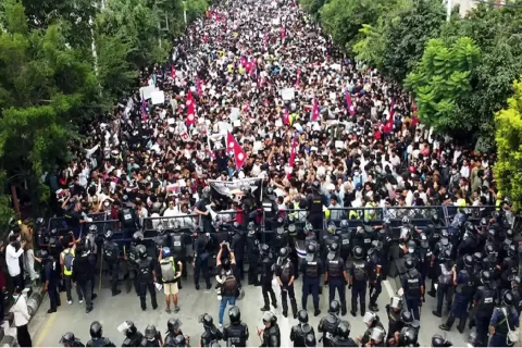 Ribuan mahasiswa menuduh pemerintah bertindak otoriter. Sejumlah demonstran bahkan membawa bendera anime One Piece sebagai simbol perlawanan.