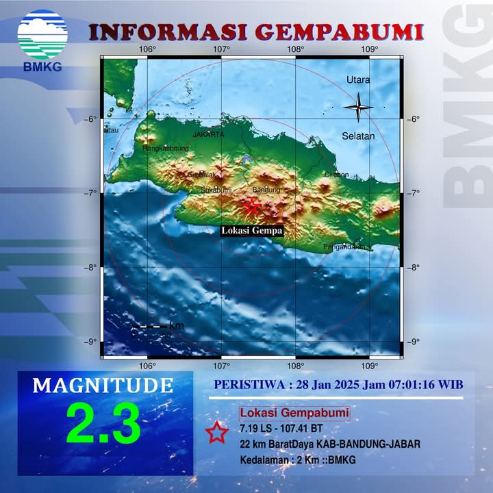#Gempa Mag:2.3, 28-Jan-2025 07:01:16 WIB, Lok:7.19 LS – 107.41 BT (Darat, 22 km Barat Daya KAB-BANDUNG-JABAR), Kedalaman:2 Km ::BMKG-PGR-II