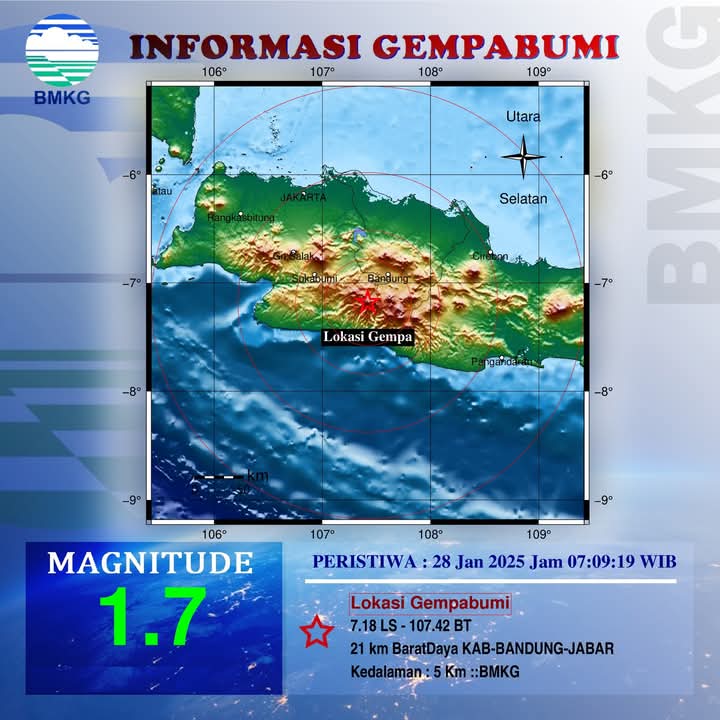 #Gempa Mag:1.7, 28-Jan-2025 07:09:19 WIB, Lok:7.18 LS – 107.42 BT (Darat, 21 km BaratDaya KAB-BANDUNG-JABAR), Kedalaman:5 Km ::BMKG-PGR-II