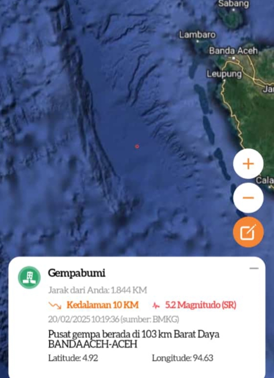 Hari Kamis 20 Februari 2025 pukul 10.19.36 WIB wilayah Pantai Barat Sumatera, Aceh Besar, Aceh diguncang gempa tektonik.