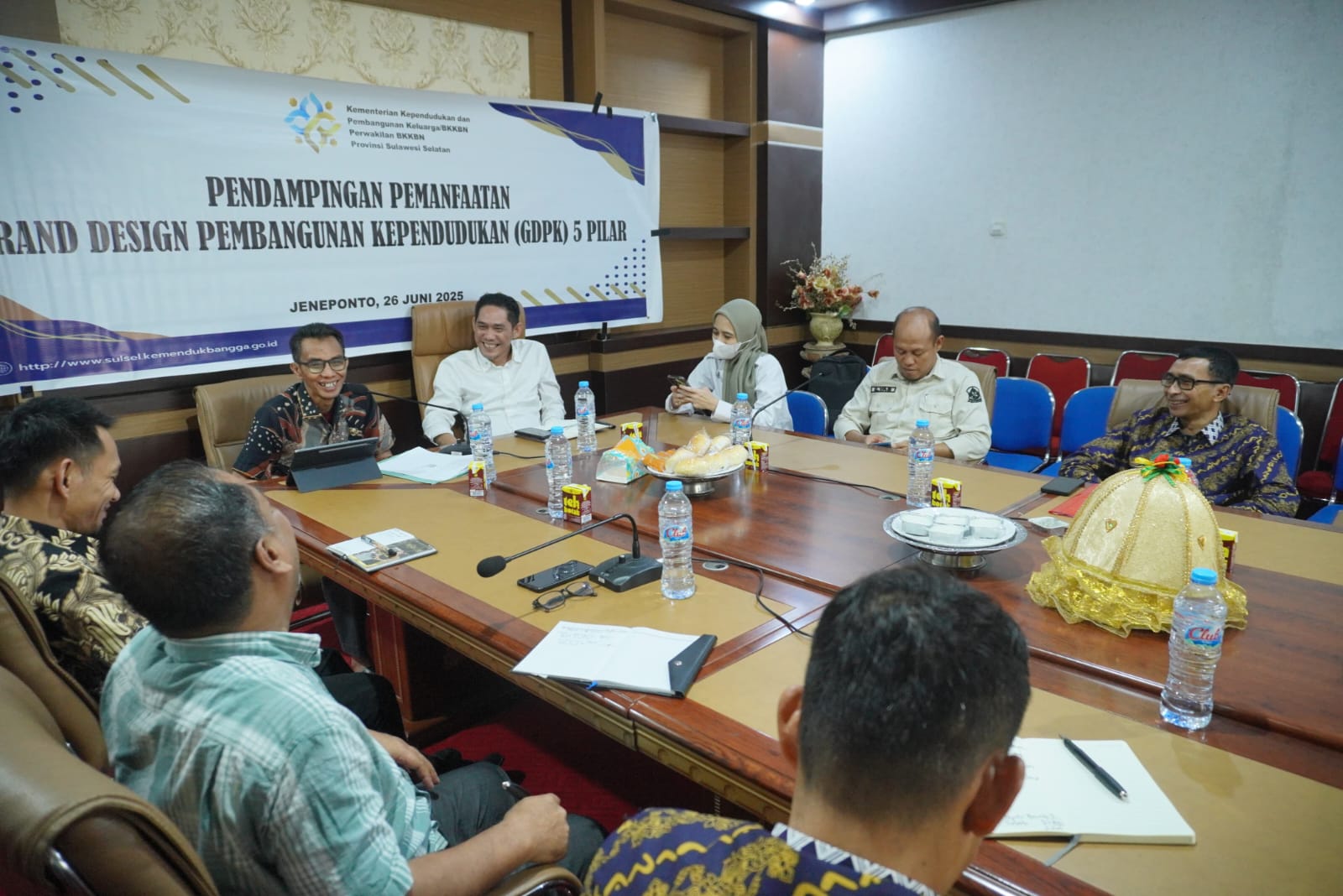 JENEPONTO – pantau24jam.net. Pemerintah Kabupaten Jeneponto melaksanakan kegiatan Pendampingan Pemanfaatan Grand Design Pembangunan Kependudukan (GDPK) Berbasis Lima Pilar, bertempat di Ruang Rapat Wakil Bupati. Kamis, 26/6/2025.
