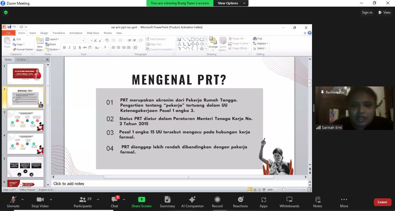 “Dalam negara hukum, produk hukum menjadi barang vital dalam menjamin dan memberikan kepastian hukum kepada seluruh warga negara Indonesia, tidak terkecuali untuk para Pekerja Rumah Tangga”, jelasnya.