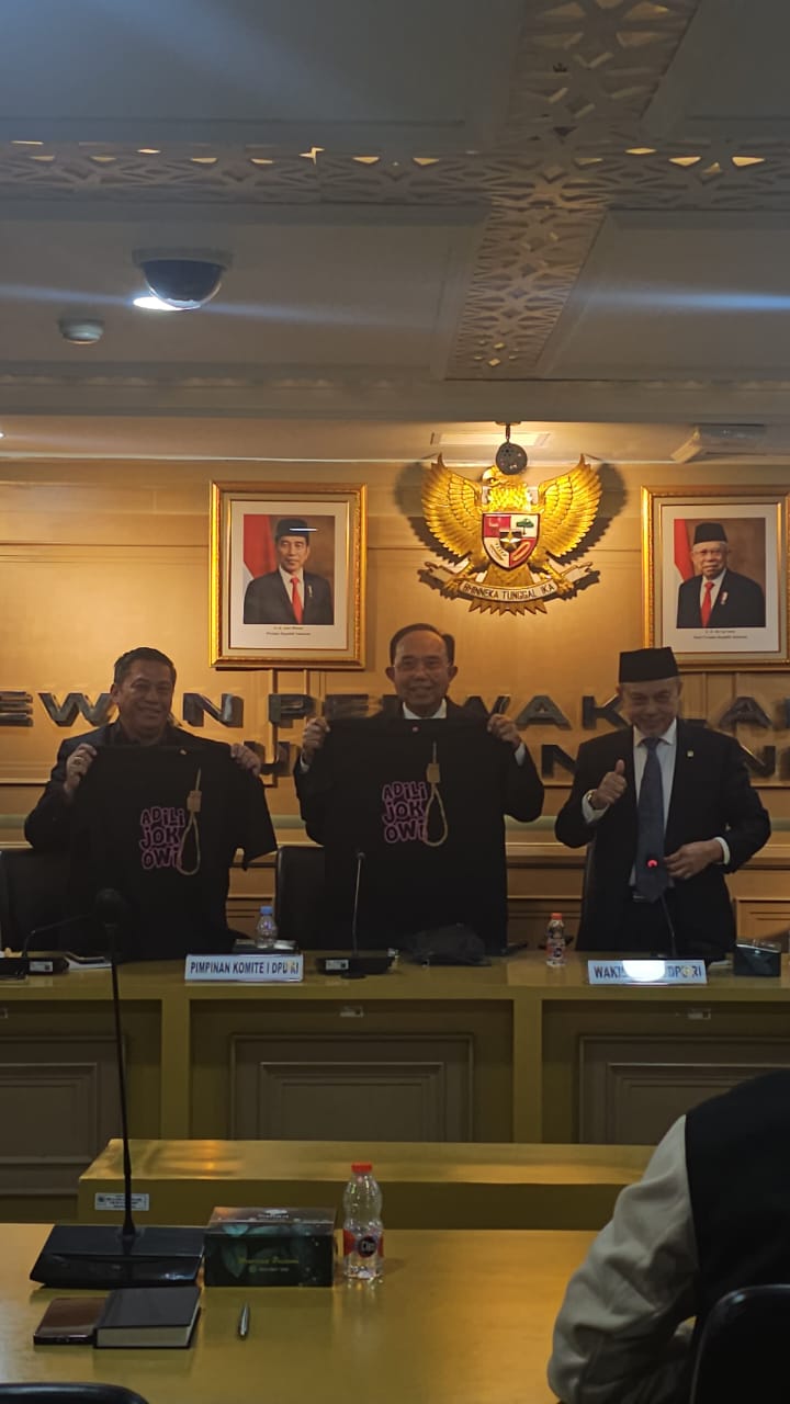 Pertemuan BARA KEMANG dengan Pimpinan DPD RI diakhiri dengan penyerahan cendera mata dari delegasi berupa Kaos Hitam bertuliskan “Adili Jokowi” dengan simbol “Tali Gantung” dan bernyanyi bersama “Mars Fufufafa”.