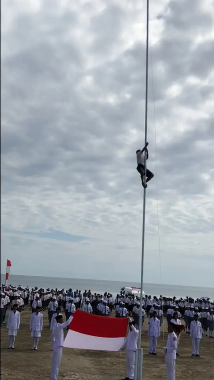 Joni memanjat tiang bendera untuk memperbaiki pengait yang bermasalah saat upacara HUT ke-73 RI. (Screenshot video viral)