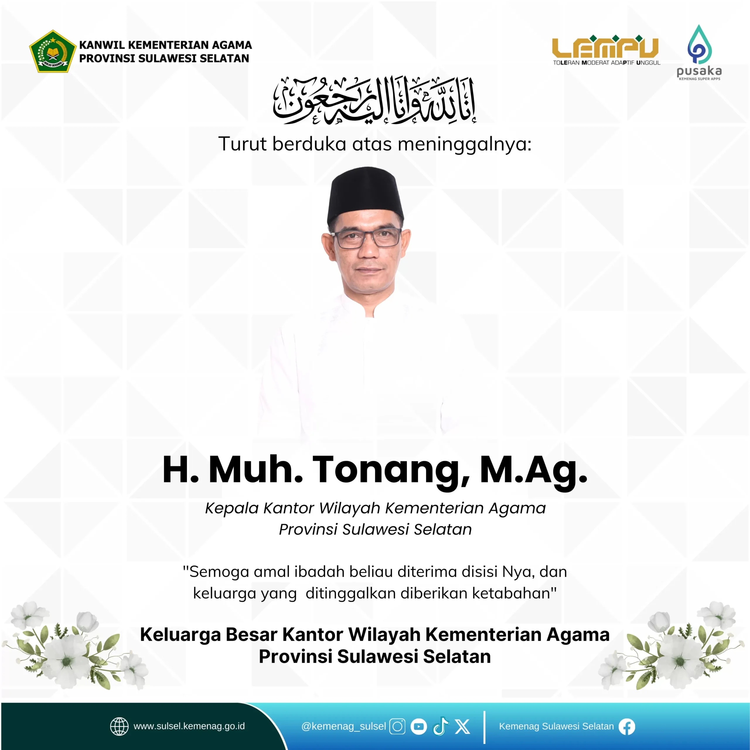 Kepala Kanwil Kemenag Sulsel wafat saat memenuhi undangan untuk hadir dalam kegiatan Kemenag di Jakarta. Sebelimnya, Muh Tonang bersama para Kepala Kanwil Kemenag provinsi seluruh Indonesia menandatangani Perjanjian Kinerja untuk program 2025 bersama Sekjen Kemenag RI.