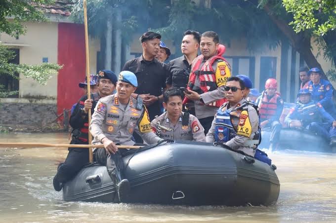 Kapolda dan rombongan menyeberang menggunakan perahu karet milik Polairud dan Basarnas untuk menyalurkan bantuan kepada warga yang terdampak.