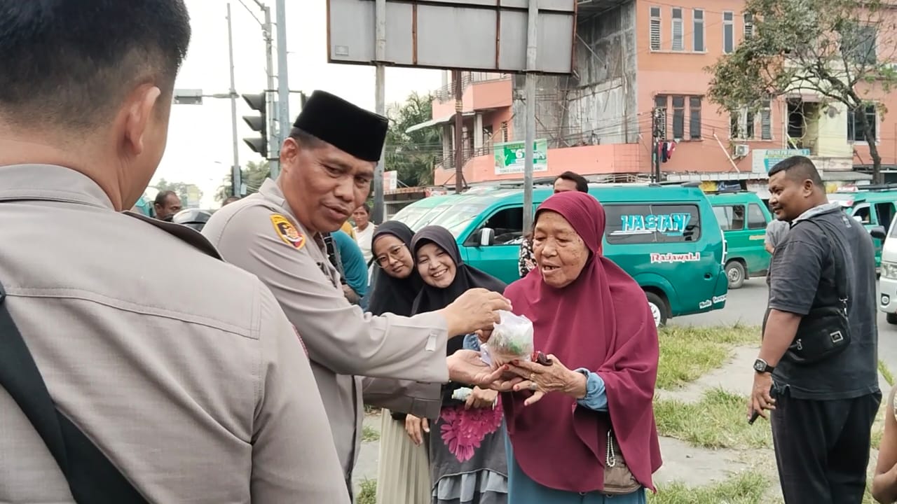 Kompol Faidir SH,MH dan Kanit Reskrim Iptu M.Y Dabutar SH,MH serta Panit I Ipda Eko Priya SH bersama personel Polsek Patumbak berbagi takjil kepada warga masyarakat Kec.Patumbak dan Kec.Medan Amplas yang melintas di jalan raya pada hari Jumat (5/3/2025) sore menjelang buka puasa.