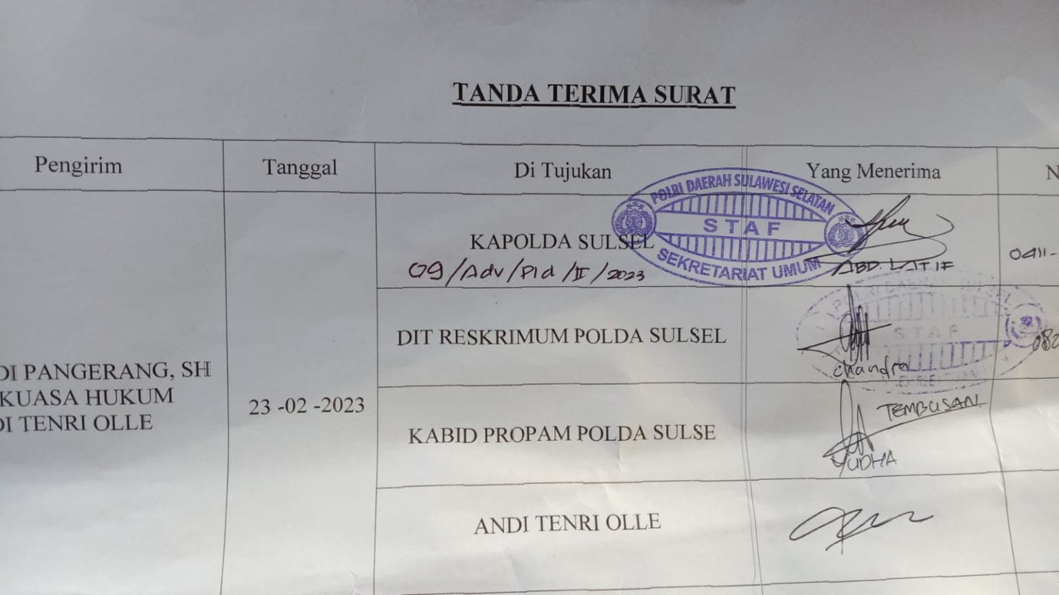 Sementara menurut AT pihak pengacaranya sudah melaporkan hal ini ke Propam Polda dengan nomor 09/ADV/Pid/II/2023 agar kasus anaknya di tangani Polda Sulsel. Beber AT kepada Media.