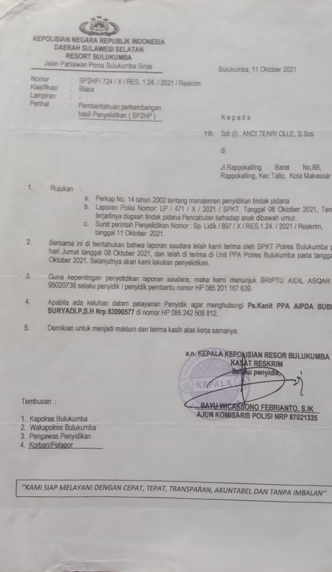 Padahal masih dalam proses pemeriksaan penyidik Unit PPA Polres Bulukumba sesuai Laporan Polisi nomor LP/B/471/X/2021/SPKT/polres Bulukumba/Polda Sulsel 8 Oktober 2021.