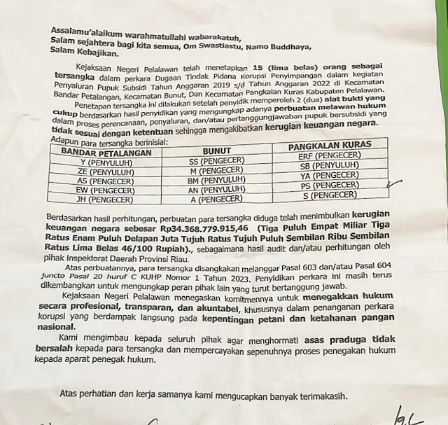 “Dari hasil penyidikan yang telah kami lakukan, Kejaksaan Negeri Pelalawan menetapkan 15 orang sebagai tersangka dalam perkara penyimpangan penyaluran pupuk subsidi,” ujar pejabat Kejari Pelalawan kepada awak media.