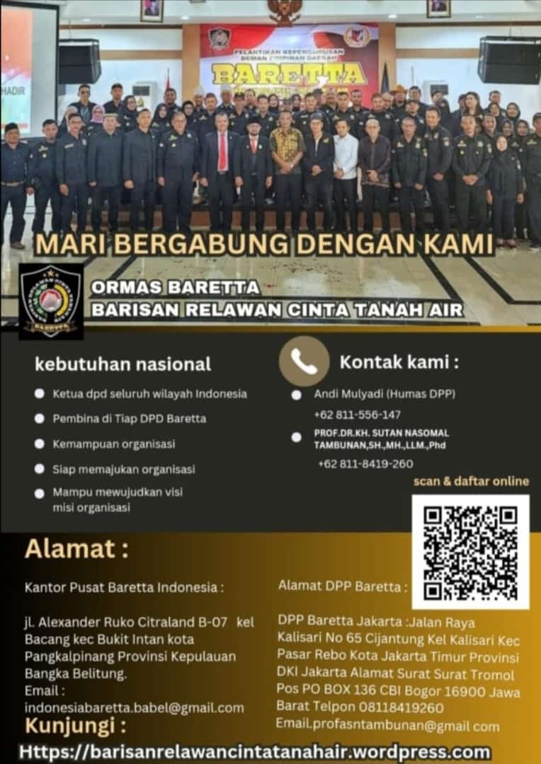 “Keutuhan negara Indonesia harus dipertahankan dari berbagai tantangan yang dapat mengancam ketertiban keamanan Negara Republik Indonesia dari Sabang Hingga Meureukenya”, pungkas Ketua Harian DPP Baretta yang juga Tokoh Alim Ulama Cendekiawan Muslim Kritikus Politikus Tokoh Hukum Pidana Internasional, Prof Dr KH Sutan Nasomal.