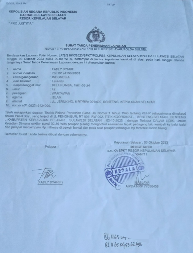 Peristiwa dugaan kasus tindak pidana pencurian tersebut, tertuang dalam lembaran laporan polisi (LP) Nomor : LP / 218/X/2023/SPKT/POLRES KEPULAUAN SELAYAR, POLDA SULAWESI SELATAN.