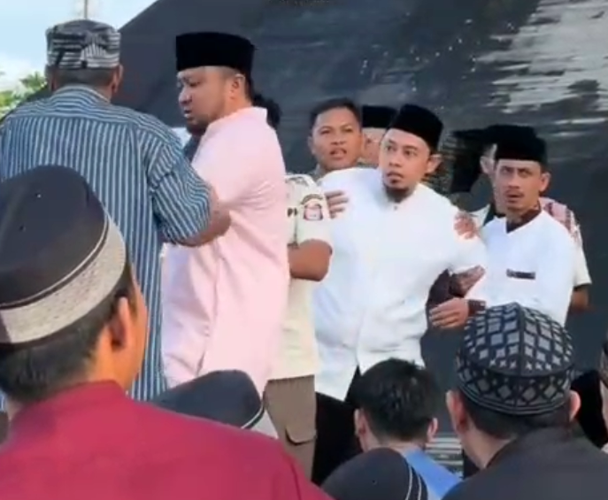 Seorang jemaah di barisan depan, mengenakan kemeja pink, mencoba menengahi situasi tersebut.