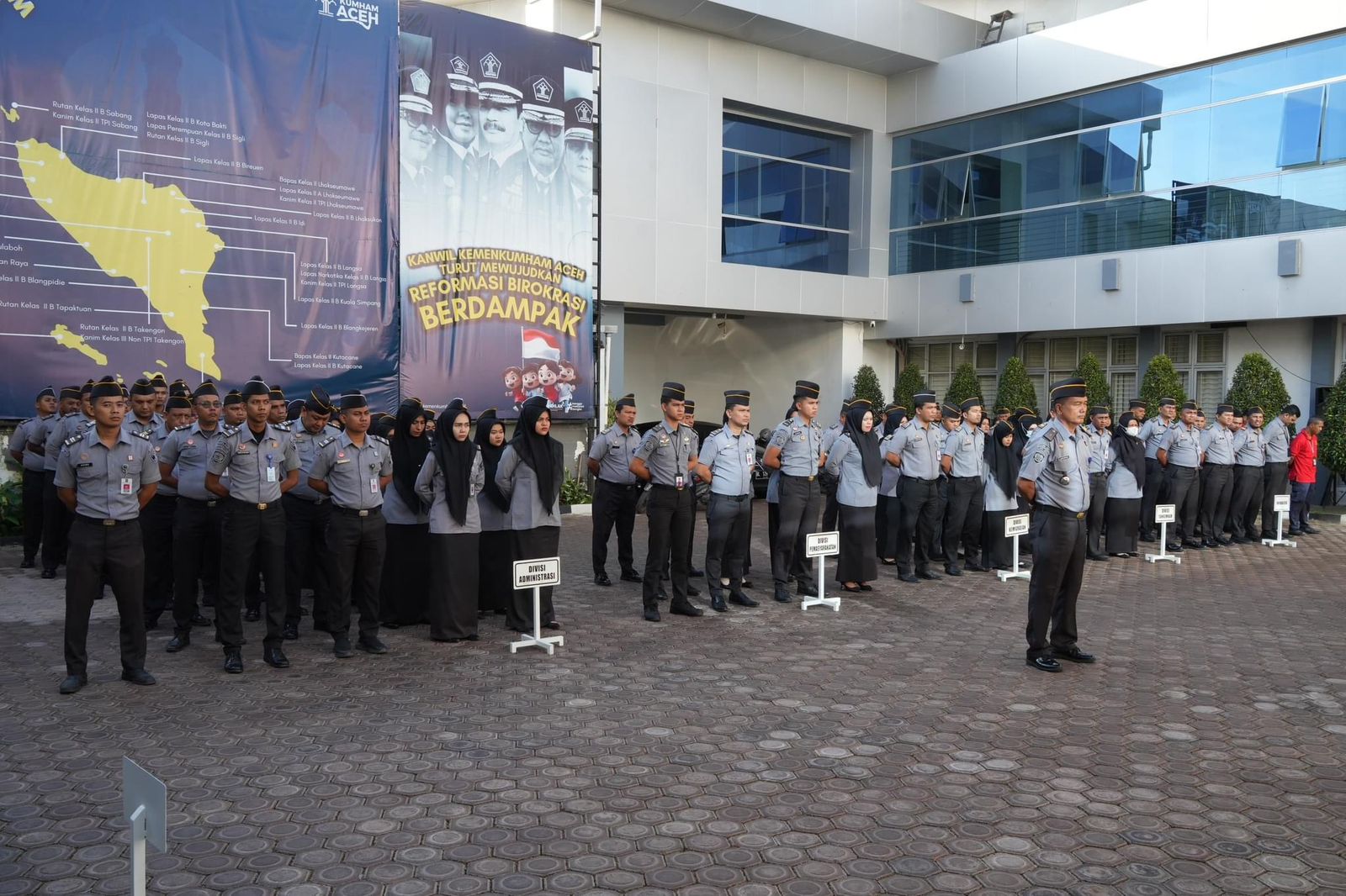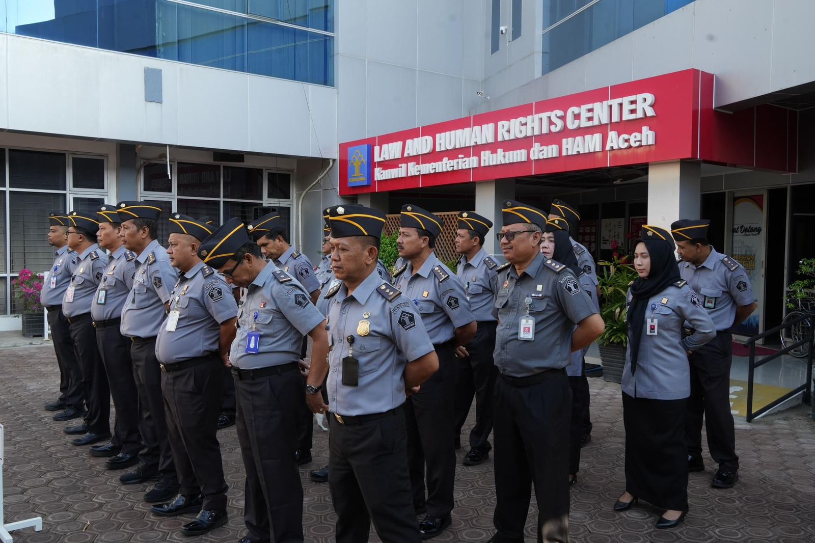 BANDA ACEH – pantau24jam.net. Kantor Wilayah Kemenkumham Aceh menggelar apel pagi yang dipimpin langsung oleh Kepala Kantor Wilayah, Meurah Budiman. Apel yang berlangsung di lapangan apel kantor wilayah ini diikuti oleh seluruh jajaran pegawai di lingkungan Kemenkumham Aceh. Senin, 18/11/2024.