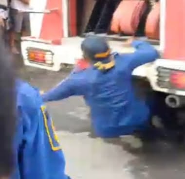 Namun tiba-tiba sopir memundurkan mobil pemadam kebakaran dengan kecepatan tinggi dan menabrak korban yang sedang menghalau warga.