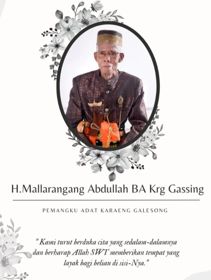 TAKALAR – pantau24jam.net. Pemangku adat Karaeng Galesong H. Mallarangan Abdullah Karaeng Gassing wafat di Galesong Kec. Galesong Kab. Takalar Sulawesi Selatan. Senin 5/8/2024.