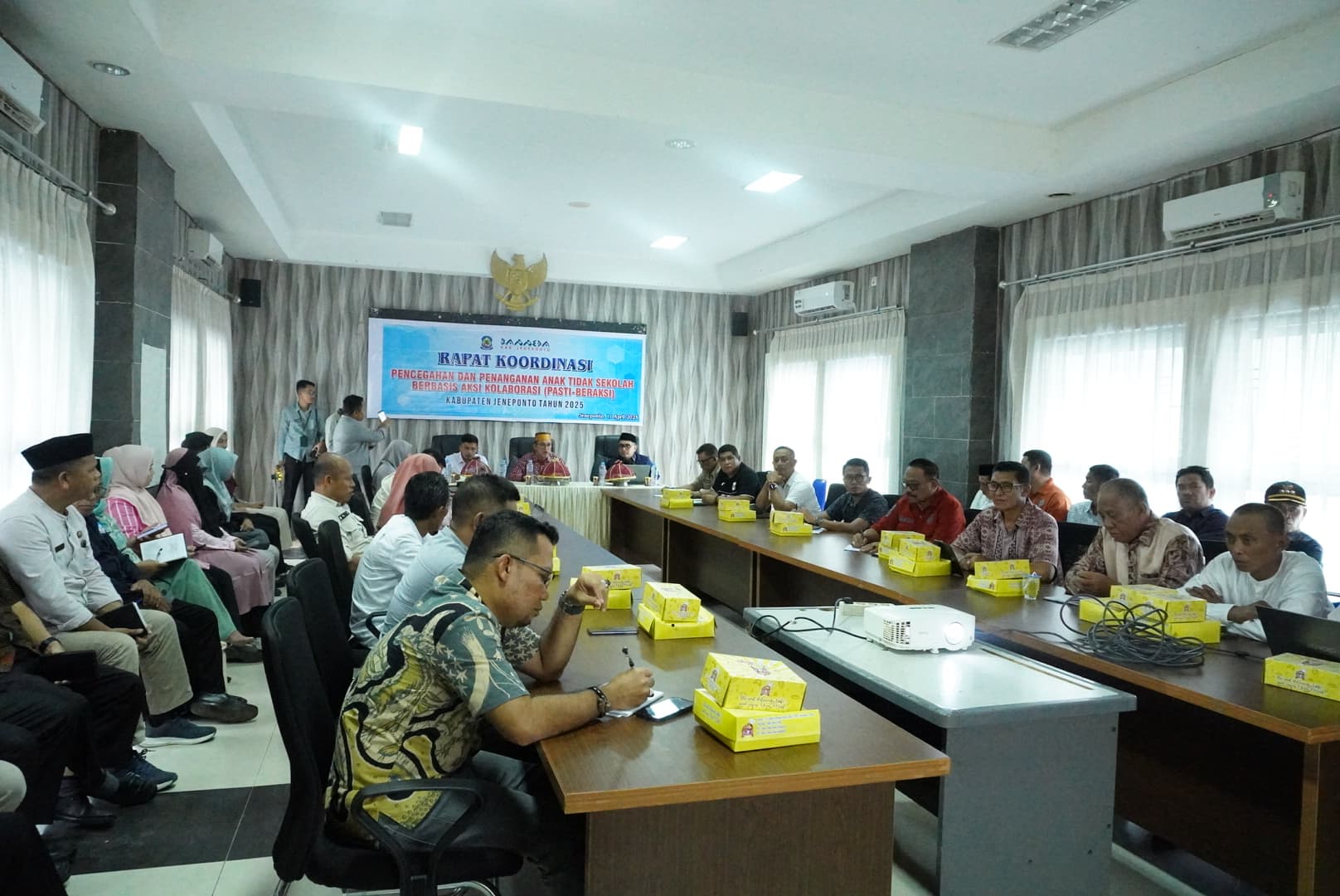 JENEPONTO – pantau24jam.net. Pemkab Jeneponto gelar Rapat Koordinasi Pencegahan dan Penanganan Anak Tidak Sekolah (PPATS) perkuat komitmen tuntaskan masalah anak tidak sekolah di Ruang Tamarunang Bappeda Jeneponto. Jum’at, 11/4/2025