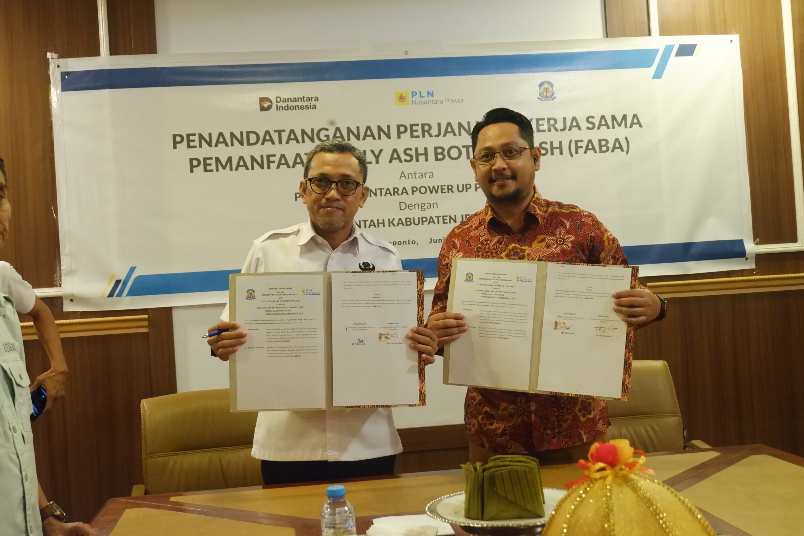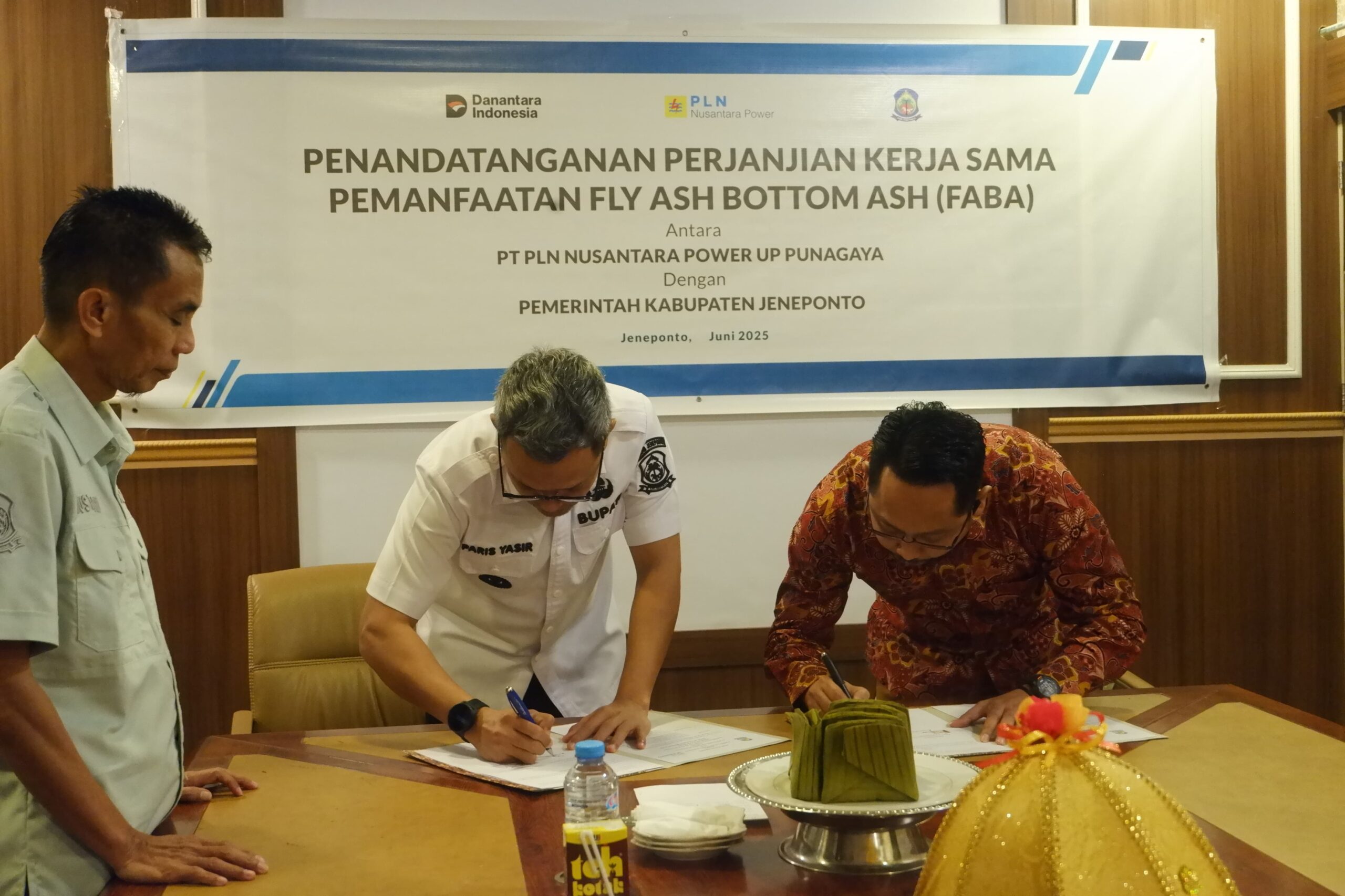 Pemkab Jeneponto resmi menandatangani Nota Kesepahaman (MoU) dengan PT PLN Nusantara Power Unit Pembangkit (UP) Punagaya terkait pemanfaatan Fly Ash dan Bottom Ash (FABA), yakni residu hasil pembakaran batu bara dari Pembangkit Listrik Tenaga Uap (PLTU). Jum’at, 20/6/2025.