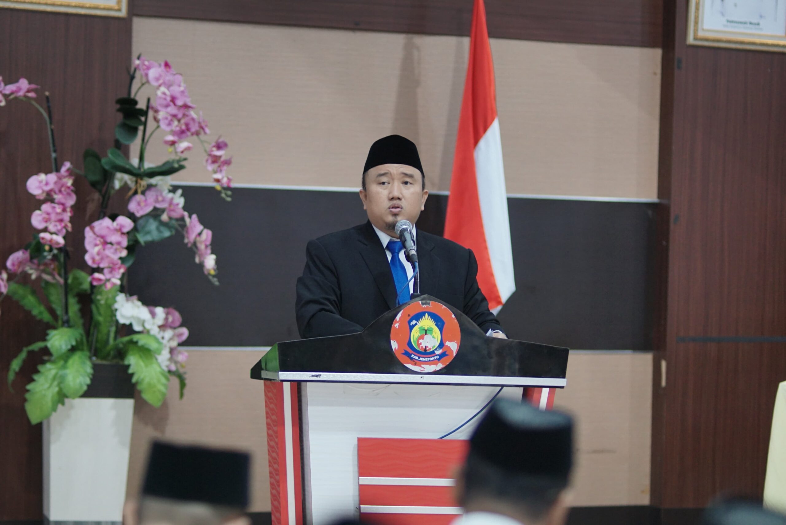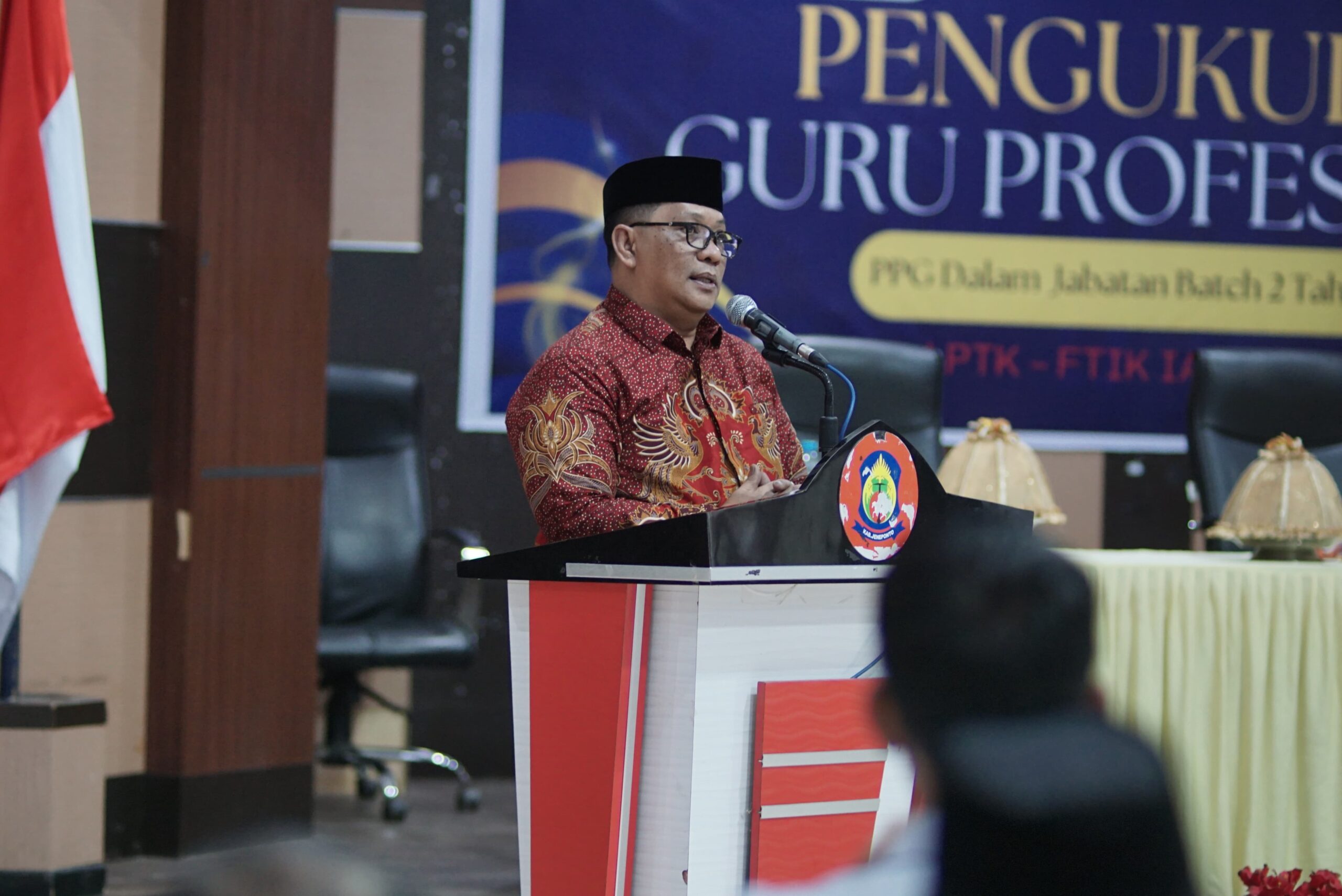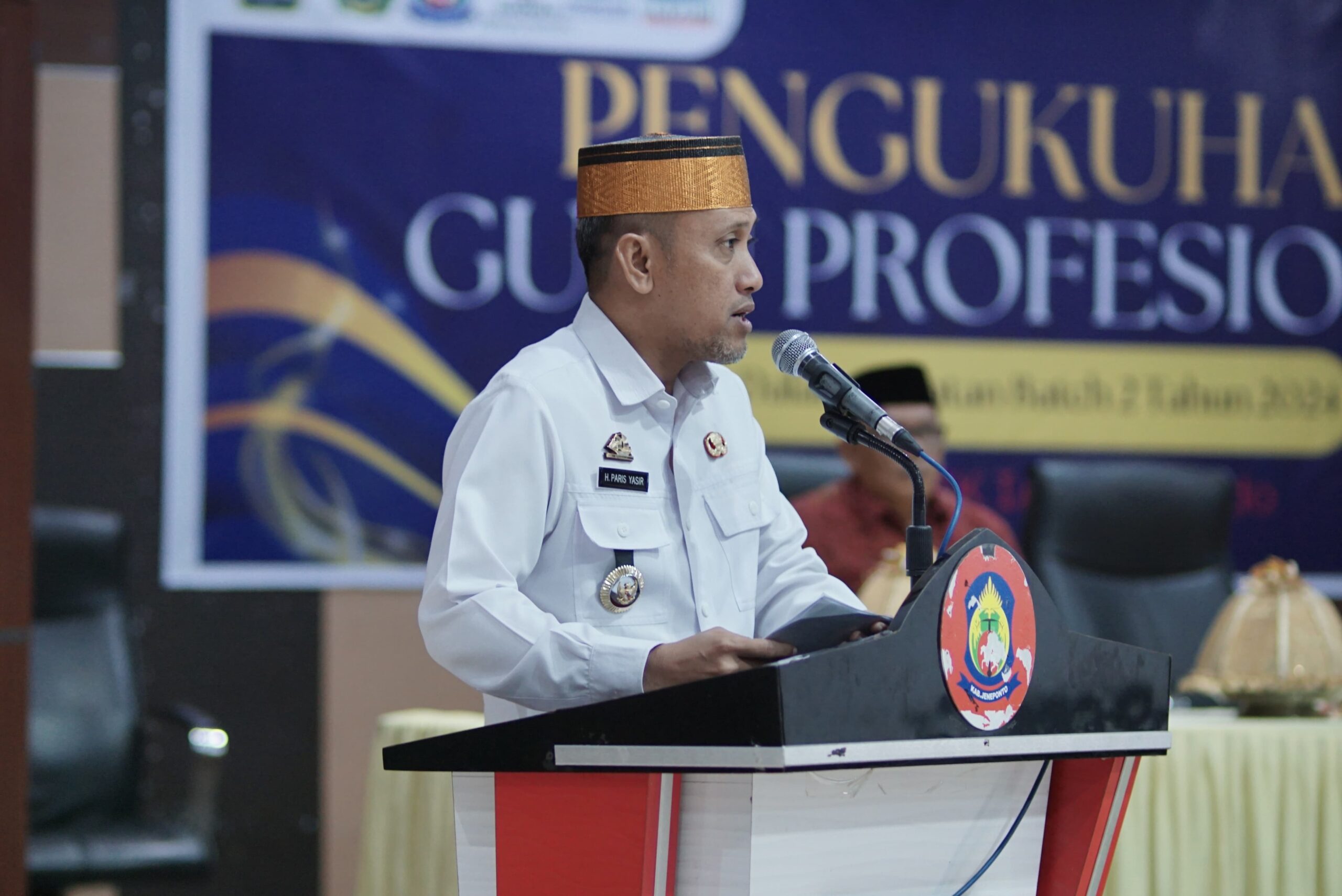 Sambutan Bupati H. Paris Yasir menyampaikan apresiasi dan ucapan selamat kepada para guru yang telah berhasil menyelesaikan proses Pendidikan Profesi Guru (PPG) dan resmi dikukuhkan sebagai guru profesional.
