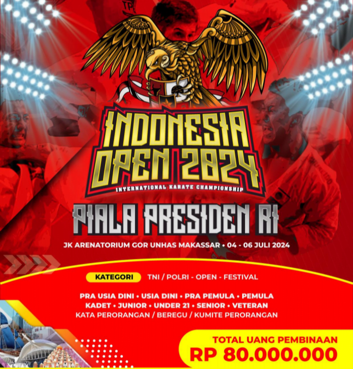 Adapun pertandingan Indonesia Open – International Karate Championship “PIALA PRESIDEN RI” tahun 2024 ialah Kategori Open dan Kategori Festival. Event ini meningkatkan prestasi para Atlet Karate di Indonesia dan sebagai ajang uji coba kompetensi untuk jenjang lebih tinggi lagi. Sambungnya.