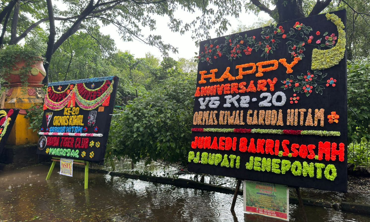 Karangan bunga berukuran sekitar 3 meter x 2 meter dari orang nomor satu di Jeneponto diletakkan di depan pintu masuk Pantai Akkarena Kota Makassar.