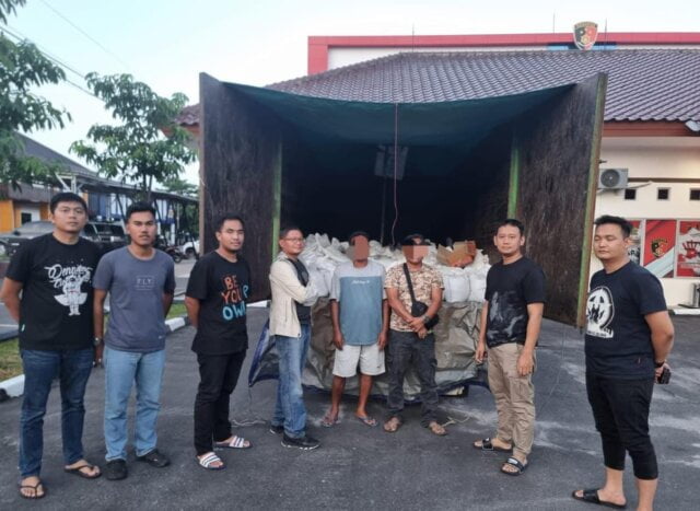 “Total ada ratusan kampil karung pasir timah yang dibawa oleh kedua tersangka dengan berat keseluruhan 8 Ton”, tambahnya.