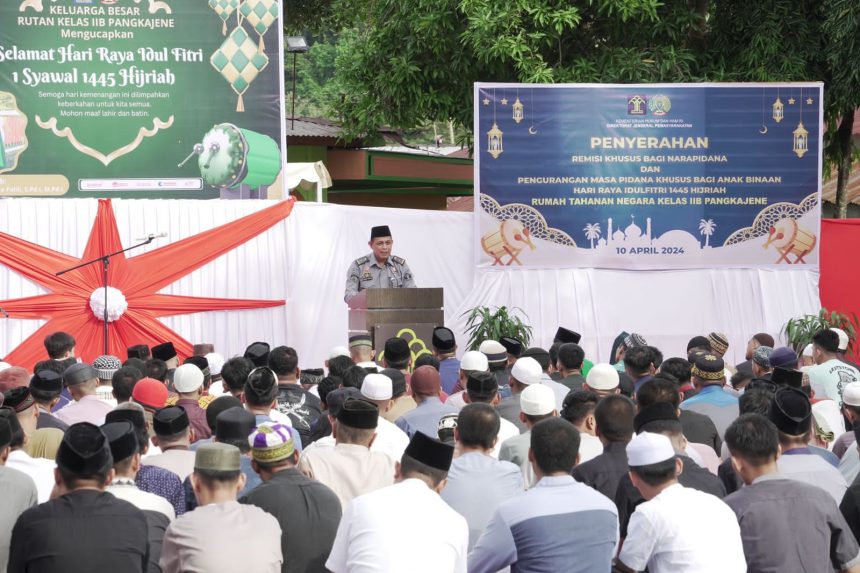 “Acara Pemberian Remisi Khusus Hari Raya Idul Fitri 1445 H kepada warga binaan Rutan Kelas IIB Pangkajene berlangsung setelah dilaksanakannya Sholat Ied”, ujar Humas Rutan Pangkep, Awal melalui keterangan pers rilis, Rabu (10/4)