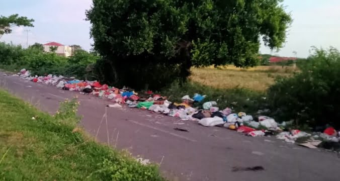 Sampah yang berserakan itu kebanyakan bungkusan sampah plastik dan potongan kain serta sterofoam bekas. Pemandangan sampah diletakkan begitu saja di pinggir jalan, padahal berada di jalan utama dan lokasi penghijauan.