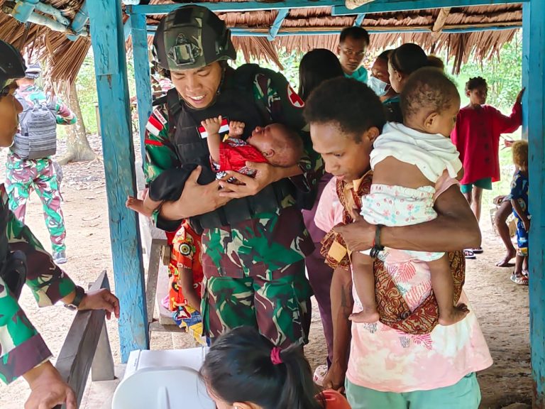KEEROM – pantau24jam.net. Personel satgas menjamin agar balita dapat tumbuh dan kembang dengan baik, Pos Kaliasin Satgas Yonif 122/Tombak Sakti bersama Puskesmas Pitewi gelar Posyandu (Pos Pelayanan Terpadu) bagi warga Kampung Kibay, Distrik Arso Timur, Kabupaten Keerom. Kamis, 18/4/2024.