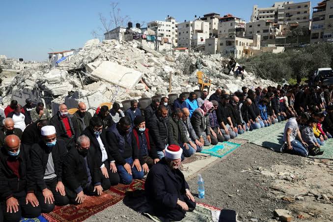 Untuk melakukan shalat, warga mendirikan area salat darurat di atas reruntuhan karena lebih dari 1.015 masjid menjadi target penjajah Israel dalam konflik tersebut.