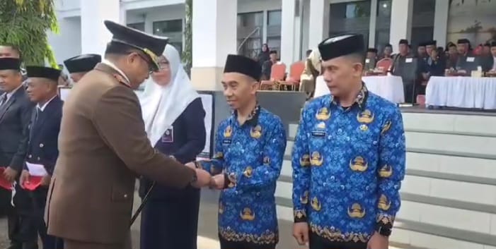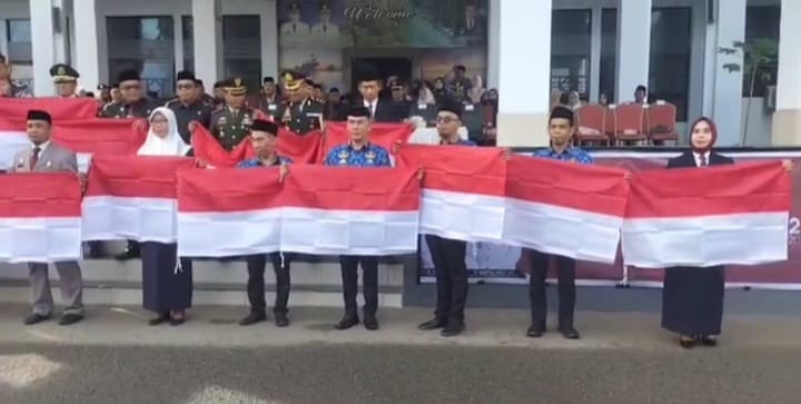 Sekda Drs. Mesdiyono, M.Ec.Dev didampingi jajaran anggota Forum Koordinasi Pimpinan Daerah, berkenan melakukan penyerahan bendera merah putih kepada para camat dan lurah, menandai launching gerakan pembagian dan pengibaran sepuluh juta lembar bendera merah putih.