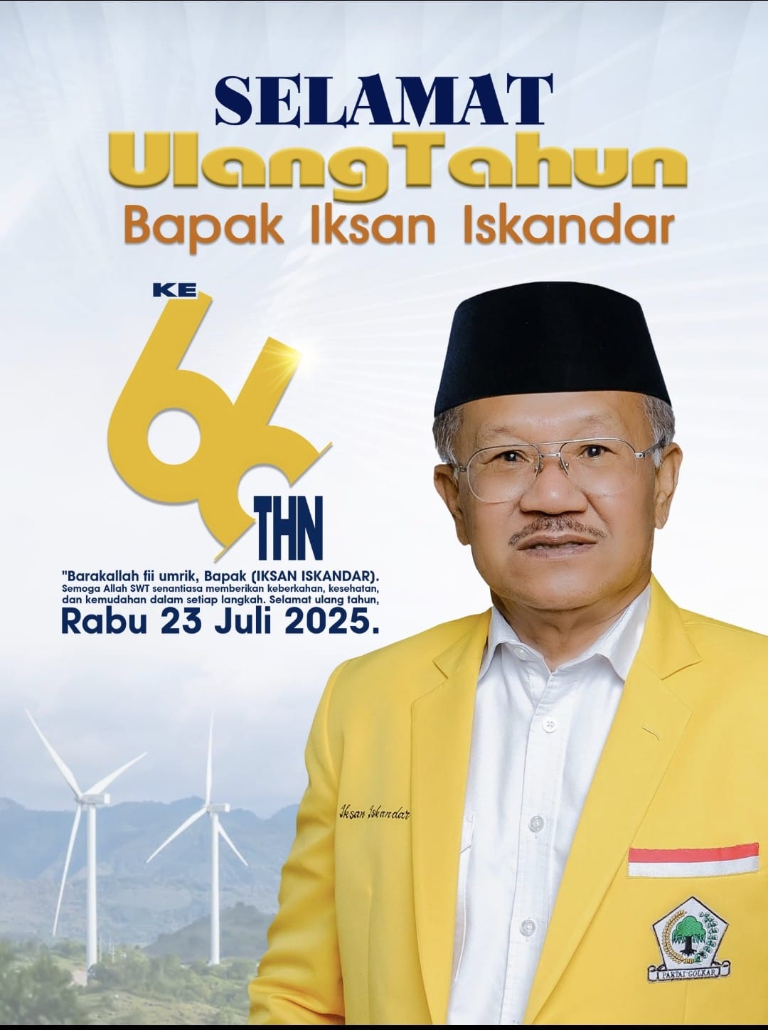 “Selamat ulang tahun Karaeng, Drs H.Iksan Iskandar M.Si Karaeng Ninra yang ke 66 tahun. Rabu 23 Juli 2025”, ujar Krg Pasang