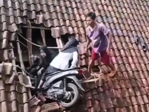 Setelah kejadian, warga sekitar berusaha mengevakuasi korban dari genteng atap rumah. Proses evakuasi memerlukan beberapa bambu untuk menopang kendaraan korban.