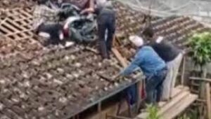 Video berdurasi 12 detik tersebut memperlihatkan dua wanita berkerudung masih duduk di atas sepeda motor matic mereka, sementara sepeda motor itu tergantung di genting atap rumah, berserakan akibat tabrakan.