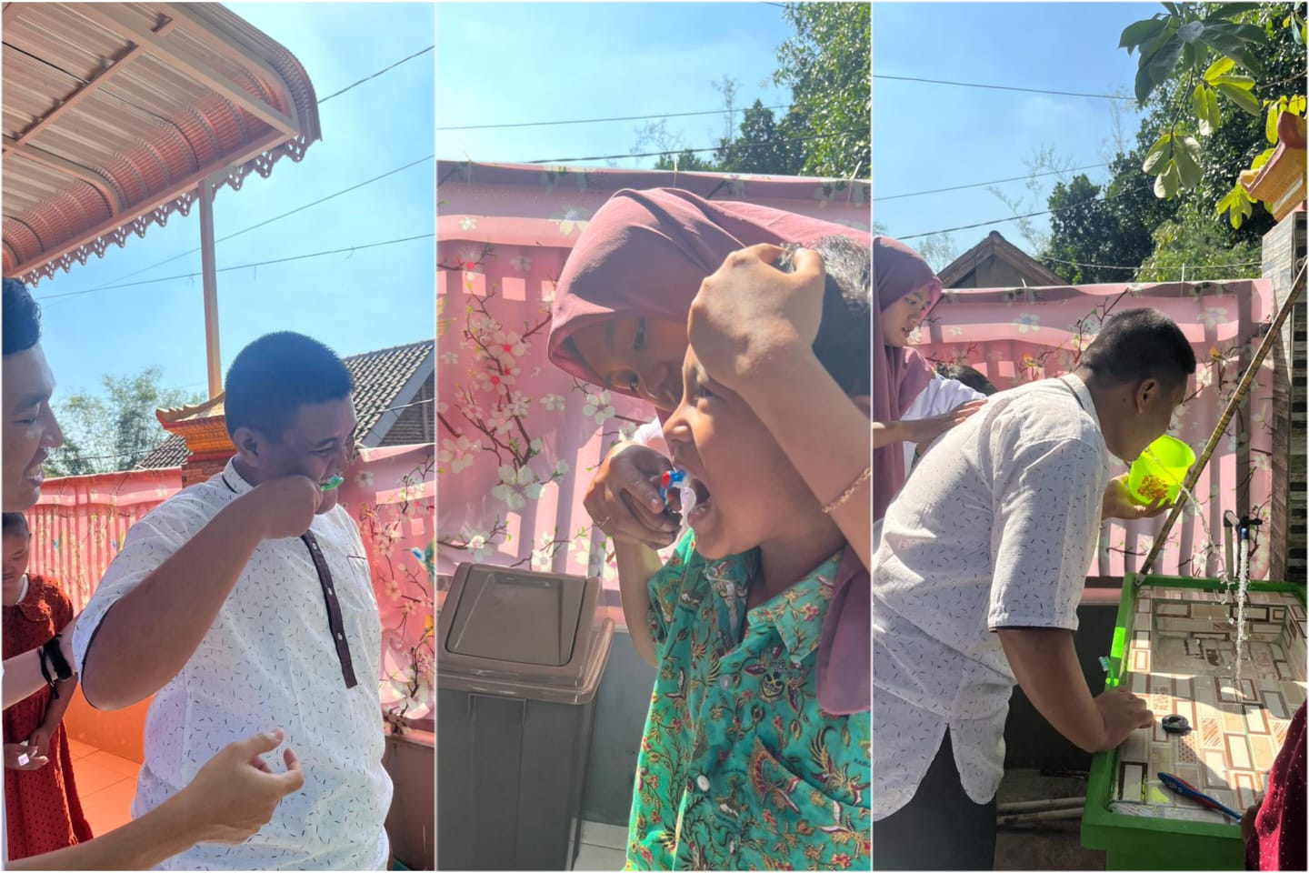 “Kita mulai dari kanan atas ya, gerakannya memutar dari atas hingga bawah kemudian diteruskan ke depan dan dilanjutkan ke sebelah kiri, jadi semuanya tersikat ya,” ungkap salah satu guru mengawali peragaan cara menyikat gigi.