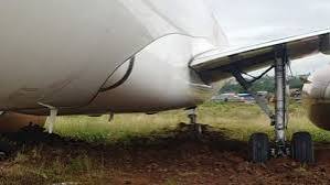 Setelah pesawat menyelesaikan fase pendaratan, bagian depan pesawat melewati batas landas pacu.