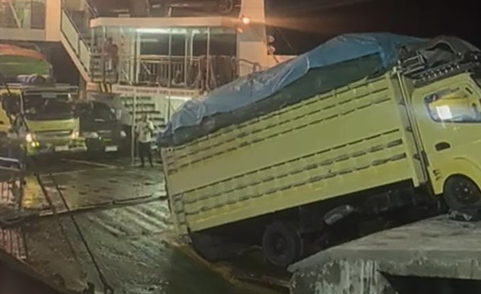 Begitu tiga mobil dibolehkan turun, truk berwarna kuning dengan plat DW 8631 MD ditutupi terpal hijau pun ikut. Ketika ban depan truk sudah berada jembatan, roda belakang masih di atas ramp door (pintu rampa).