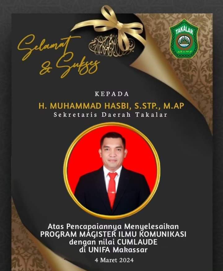 Takalar, Pantau24jam.net – Sekda Kabupaten Takalar, Muhammad Hasbi, berhasil menyelesaikan program Magister Ilmu Komunikasi (MIKOM) dengan nilai Cumlaude saat pengumuman hasil ujian akhir yang diadakan di ruang rapat rektorat Universitas Fajar Makassar (Unifa), Senin (4/3/2024).